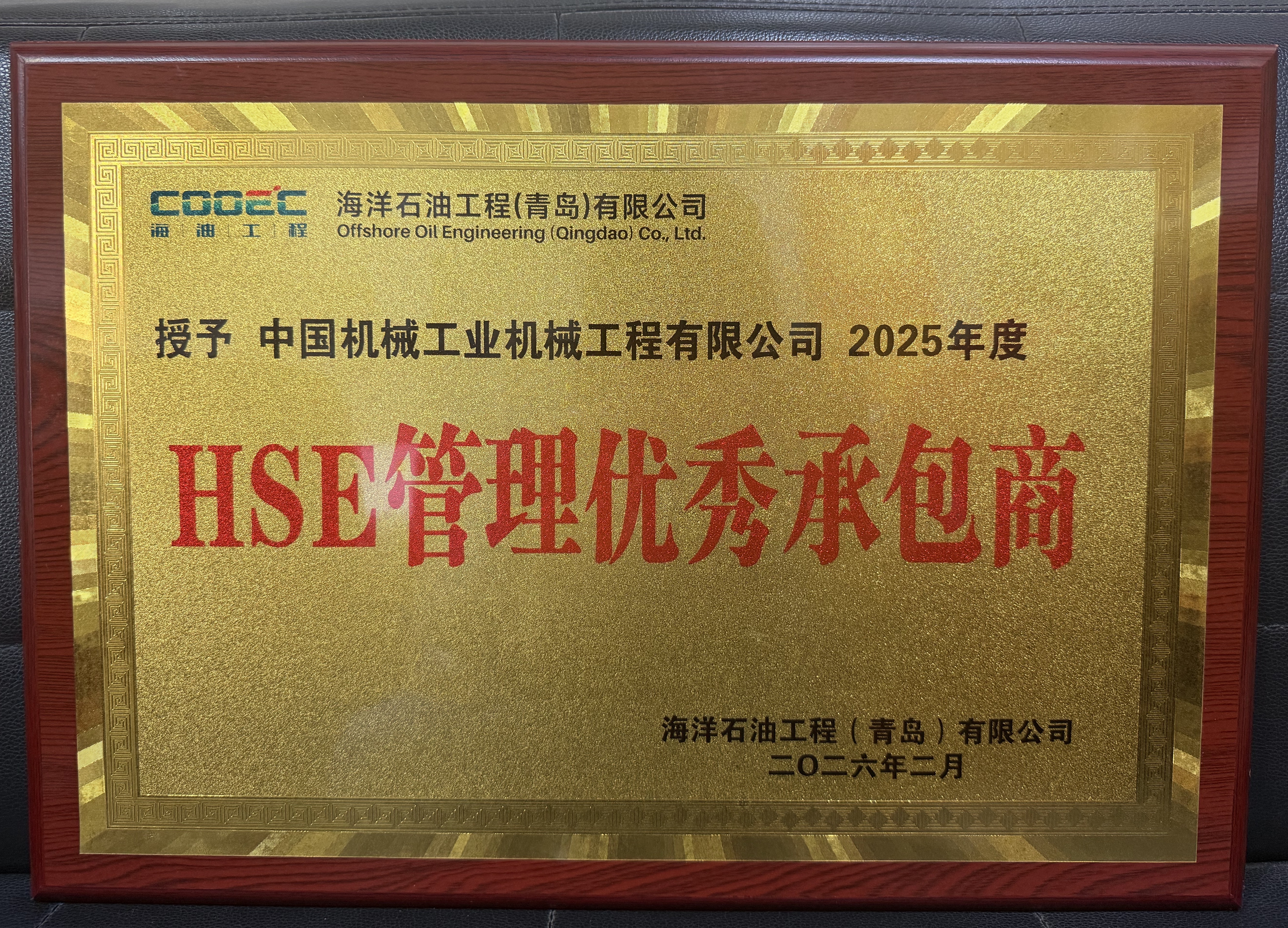 近日,在海洋石油(yóu)工程(青島)有限公司承包商安全生產大會上,公司憑借在項目執行過程中的優秀表現和突出貢獻,被授予“2025年度(dù)HSE管理優秀承(chéng)包商”稱號,公司黨委書記、董事長陳(chén)前銀(yín)應邀出席會議並領獎(jiǎng)。
